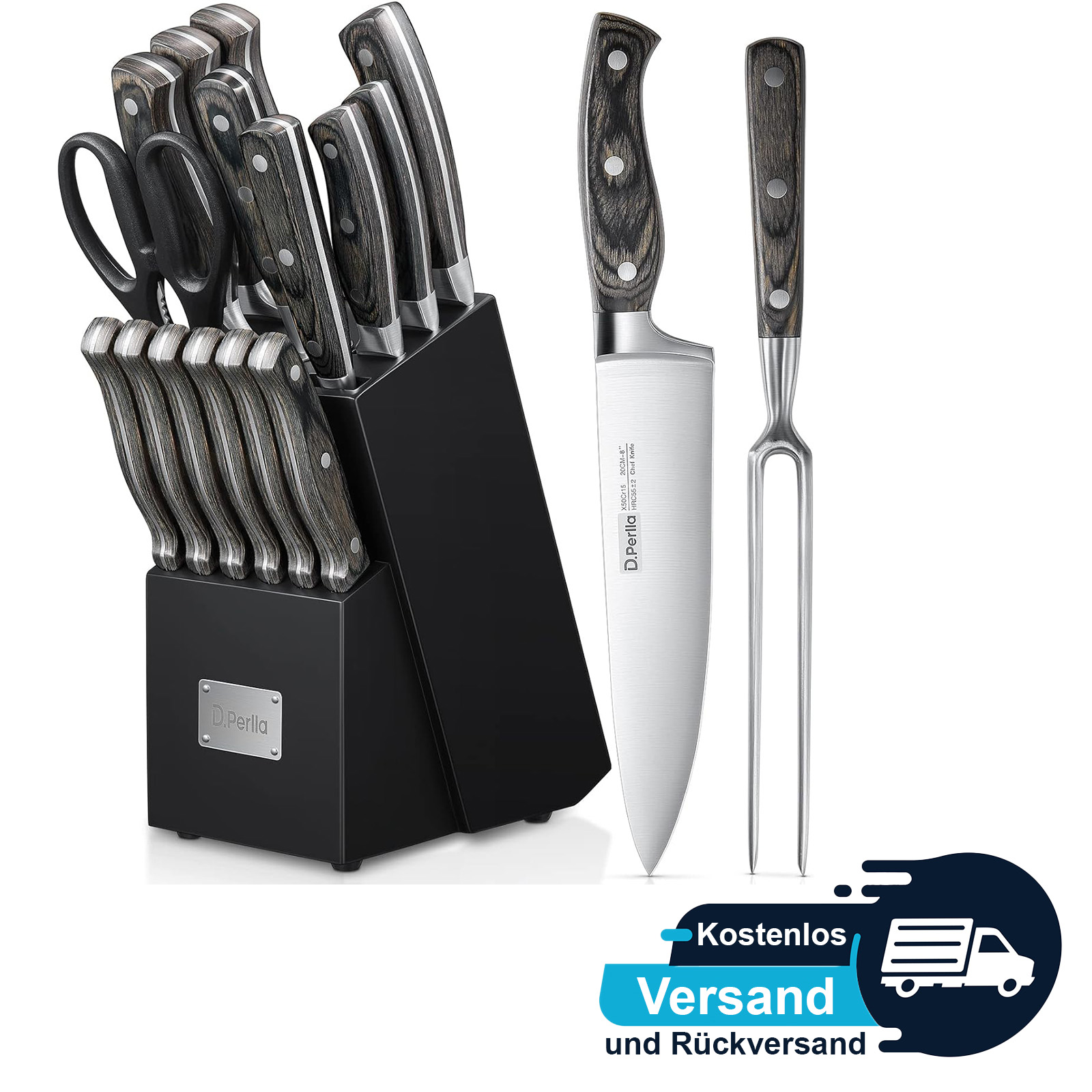 🍴 Vielseitiges Messerblock-Set: Ideal für Hobbyköche und Anfänger, inklusive Holzmesserblock, Chefkochmesser, Fleischmesser, Brotmesser mit Doppelwellenschliff, Santokumesser, Allzweckmesser, 6 Steakmesser, Gemüsemesser, Schälmesser, Wetzstahl und Küchenschere.